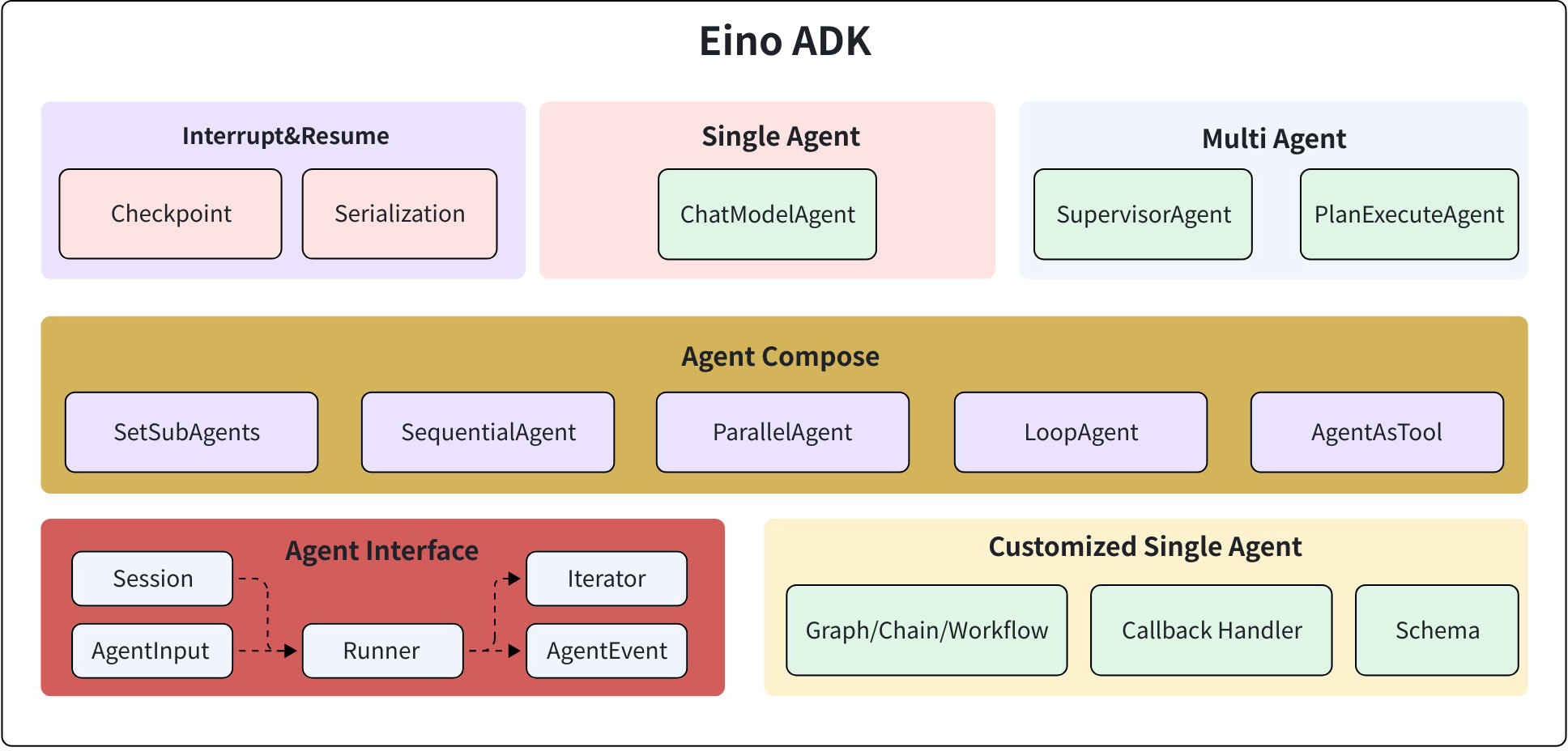 Eino ADK 参考 Google-ADK 的设计,提供了 Go 语言 的 Agents 开发的灵活组合框架,即 Agent、Multi-Agent 开发框架。Eino ADK 为多 Agent 交互时,沉淀了通用的 上下文传递、事件流分发和转换、任务控制权转让、中断与恢复、通用切面等能力。 适用场景广泛、模型无关、部署无关,让 Agent、Multi-Agent 开发更加简单、便利,并提供完善的生产级应用的治理能力。