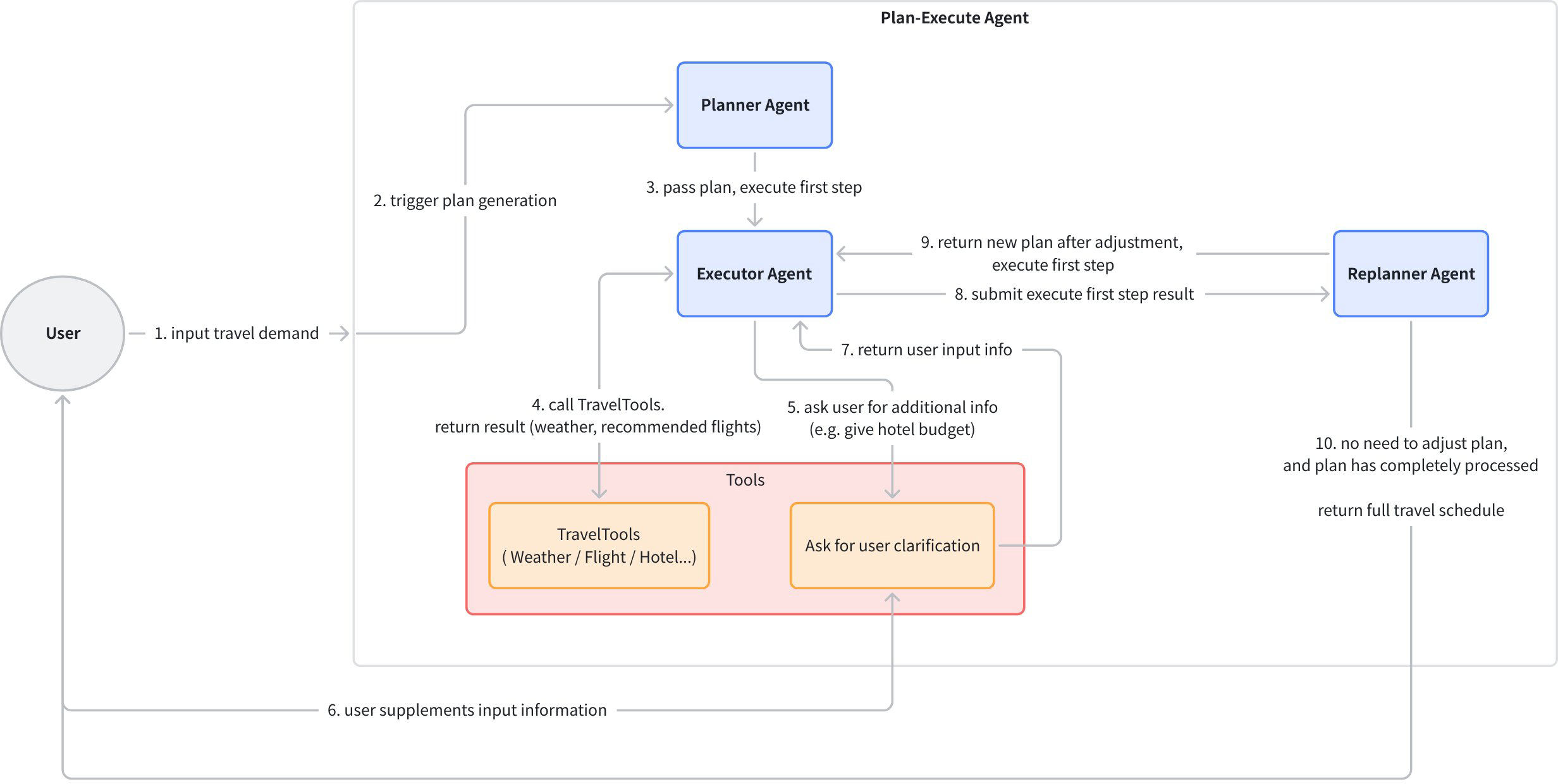 plan-execute 案例 | 本示例基于 eino adk 实现 plan-execute-replan 模式的多 Agent 旅行规划系统,核心功能是处理用户复杂旅行请求(如 “3 天北京游,需从纽约出发的航班、酒店推荐、必去景点”),通过 “计划 - 执行 - 重新计划” 循环完成任务: 从结构上看,plan-execute-replan 分为两层: | ![]() |